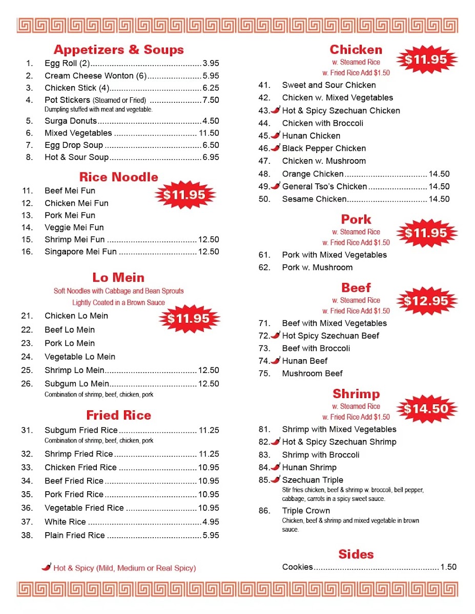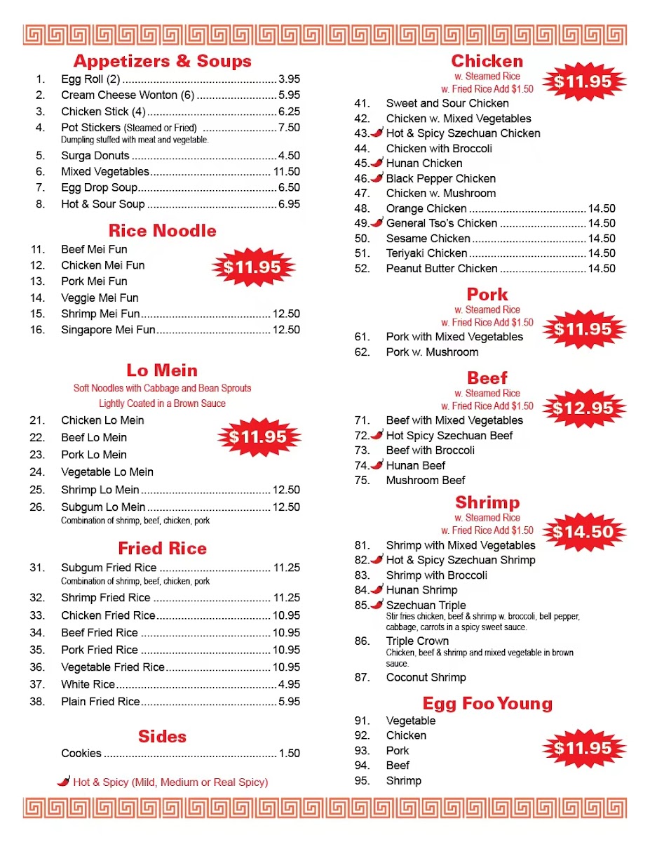The lunch menu provides structured meal options served with complementary sides, including fried rice, cheese wontons, or egg rolls depending on the day of the week. Popular dishes on the lunch menu include Lo Mein, Sweet & Sour Chicken, and Chicken with Mixed Vegetables. These meals are designed for a casual dining experience with consistent serving accompaniments.